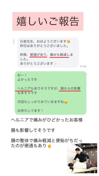 T様の場合、MRI検査で腰椎3番のヘルニアが確認されました。しかし、当院で詳しく検査したところ、左の大腸周辺に強い圧痛があり、お尻の筋肉も非常に硬くなっていました。呼吸法を使った施術で筋肉を緩めると、痛みが軽減しました。これは、内臓の不調や筋肉の緊張も痛みの原因になっていたことを示しています。
